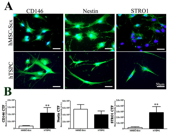 Expression of stem cell markers in hMSC-Scx cells and hTSPCs. (A) Representative fluorescent images of CD146, Nestin and STRO1 (in green color) and nuclear counterstain DAPI (in blue). (B) Digital quantification of CD146, Nestin and STRO1 fluorescent intensity levels. Bar charts represent mean ± standard deviation; ** p < 0.01, n = 3 (three independent experiments per cell type).