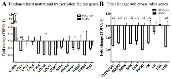 Gene expression profiling of 2D hMSC-Scx cell and hTSPC cultures. (A) QPCR for tendon related genes. (B) QPCR for other lineage-related and cross-linking genes. Statistical significance: * p < 0.05, ** p < 0.005 and *** p < 0.001, n = 3 (three independent experiments per cell type). Only genes with significant change in expression are plotted. For full gene lists and gene names, refer to Table 1 and Table 2.