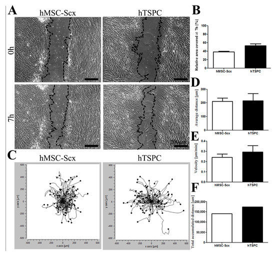HMSC-Scx and hTSPC migration potential. (A) Representative images of wound closure at the beginning and the end of the experiment. The cellular fronts are outlined with black lines. (B) Calculation of area covered by cells in % to the initial wound area. Nine scratches per cell type were analyzed (n = 9). (C) Plots showing the forward migration index, where each black line is an individual cell track. (D–F) Quantification of the average and total accumulated distances and the cell velocity (n = 320 tracks per cell type).