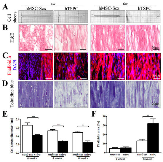 Cell sheet morphology and size. Representative gross morphological (A) and H&E (B), phalloidin (C) and toluidine blue (D) images taken at 4w or 6w after sheet assembly. Quantification of average sheet diameters of hMSC-Scx cells and hTSPCs at 0 (day of sheet assembly), 4w and 6w. (E) and phalloidin-positive area (F) at both examined time points. 4w, 4 weeks; 6w, 6 weeks.