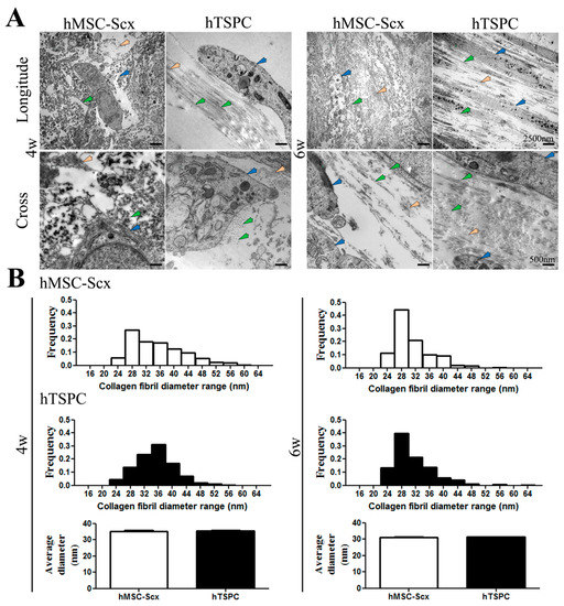 TEM and collagen fibril diameter analyses. (A) Representative TEM images from cross and longitudinal sections of hMSC-Scx and hTSPC sheets at 4w or 6w of maturation (cells indicated with blue arrow heads, collagen-like fibers indicated with green arrow heads and other unknown fibers indicated with orange arrow heads). (B) Frequency distribution of various collagen fibril diameters and average diameters of both types of cell sheets at 4w or 6w. 4w, 4 weeks; 6w, 6 weeks.
