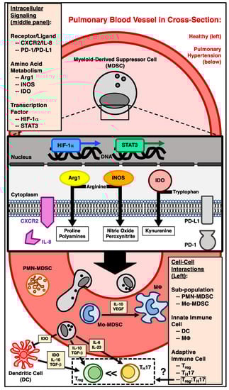 Illustration detailing potential myeloid-derived suppressor cell (MDSC) contributions to pulmonary vascular remodeling and development of pulmonary hypertension (PH). Displayed are proposed intracellular and intercellular MDSC-mediated mechanisms in the development of PH. These include, although are not limited to: receptor/ligand interactions (CXCR2/IL-8 and PD-1/PD-L1), regulation of amino acid metabolism favoring cellular proliferation and aberrant wound repair (arginine via Arg1 and iNOS, and tryptophan through IDO), and transcription factor stabilization and activation (HIF-1α and STAT3). Cell–cell interactions include molecular cross-talk between: subpopulations of MDSC (PMN-MDSC and Mo-MDSC), innate immune cells (MΦ and DC), and—finally—adaptive immune effector cells (Treg and TH17). The disarrangement of the latter cell groups’ ratio (Treg:TH17) is likely of particular importance in influencing the microenvironment favoring pulmonary vascular remodeling and PH. Abbreviations: CXCR2 (C-X-C motif chemokine receptor type 2); IL-8 (interleukin 8); PD-1 (programmed cell death protein-1); PD-L1 (programmed death-ligand 1); Arg1 (arginase-1); iNOS (inducible nitric oxide synthase); IDO (indoleamine-pyrrole 2,3-dioxygenase); HIF-1α (hypoxia-inducible factor-1 alpha); STAT3 (signal transducer and activator of transcription 3); PMN-MDSC (polymorphonuclear MDSC); Mo-MDSC (monocytic MDSC); DC (dendritic cell); MΦ (macrophage, particularly M2-polarized); Treg (regulatory T cell); TH17 (T helper 17 cell); IL-10 (interleukin 10); VEGF (vascular endothelial growth factor); IL-6 (interleukin 6); IL-23 (interleukin 23); TGF-β (transforming growth factor beta).