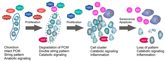 Human osteoarthritis onset and progression. Illustration of the relationship of signaling and superficial cell spatial organization (SCSO). Overview about key proteins in relation to changes in the SCSO of human articular cartilage (AC), which is based on the subsequent chapters that provide a detailed review of the individual pathways. In the superficial zone (SZ) of normal human adult AC differentiated chondrocytes are arranged in string patterns embedded in the pericellular matrix (PCM) and mediate extracellular matrix (ECM) maintenance. The onset of osteoarthritis (OA) is characterized by proliferation. During formation of double string patterns, the PCM is progressively degraded, presumably by MMPs and other catabolic factors. Proliferation in early OA is dependent on fibroblast growth factor 2 (FGF2), transforming growth factor β (TGF-β), wingless-type MMTV integration site family (WNT), and notch homolog (NOTCH) signaling, whereas catabolic matrix metalloproteinase (MMP) expression is mediated by FGF2, a switch in TGF-β signaling and inflammatory cytokines including IL-6. Subsequently, the processes maintaining sustained proliferation and ECM degradation lead to formation of cell clusters that develop from double strings. At the stage of SCSO clusters, pronounced inflammation outweighs attenuated growth factor impact. Late stage OA, accompanied by macroscopic ECM erosion, is characterized by senescence and apoptosis of cartilage-inherent cells and predominance of inflammation.