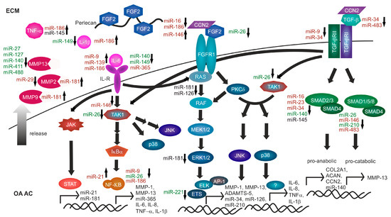 This chapter summarizes the current evidence concerning 27 miRNAs, respectively miRNA families, with a significant up- or downregulation in human OA AC, compared to normal AC. As illustrated in Figure 2, differentially regulated miRNAs interfere with inflammatory cytokine, FGF2 and TGF-β downstream signaling, which, additionally, exhibit an intense crosstalk at the protein level. In human OA AC expression of pro-catabolic target genes is mediated by NF-κB, MAPK and SMAD signaling, whereas pro-inflammatory targets are activated downstream of MAPK and NF-κB signaling. Though proliferation prevails during early OA, expression of catabolic ECM degrading proteins is concomitantly induced. Advanced stages of OA are characterized by sustained activation of inflammatory cytokine signaling, whereas proliferation ceases. Regarding the here discussed miRNAs, there is primarily a net upregulation of IL-6, whereas both positive and negative regulation of NF-κB signaling is reported. Moreover, in human OA AC upregulation of CCN2 and significantly enhanced activation of ERK, JNK and p38 MAPK pathways has been documented. Yet, evidence for ERK signaling regulation by miRNAs is contradictory. In contrast, TGF-β signaling is globally downregulated as a consequence of miRNA presence, especially with a negative regulation of the anabolic SMAD3-mediated pathway, both on protein and miRNA level. In addition, at miRNA level, particularly a reversal of negative regulation of MMP-13 is present in OA AC, which might be also due to many studies specifically examining MMP-13, since several other MMPs are upregulated at protein level, whereas no miRNA-dependent regulation has been examined to date.