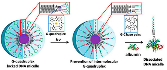 - Jin, C.; Liu, X.; Bai, H.; Wang, R.; Tan, J.; Peng, X.; Tan, W. Engineering stability-tunable DNA micelles using photocontrollable dissociation of an intermolecular G-quadruplex. ACS Nano 2017, 11, 12087–12093. [Google Scholar] [CrossRef] [PubMed]
