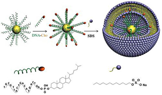 Schematic of formation of hetero-vesicles through the frame guided assembly process. Firstly, the gold nanoparticles were modified with 20-mer and 6-mer ssDNA. Then, DNA-cholesterol conjugates as leading hydrophobic groups were anchored to gold nanoparticles by base pairing interaction. Finally, the cholesterol molecules of the frame guided the assembly of amphiphilic SDS molecules. Reproduced with permission from the authors of a previous paper [32]. Copyright 2015 John Wiley and Sons Publisher.