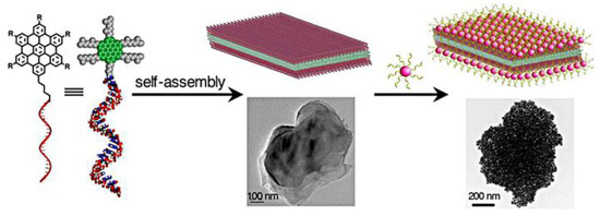 Illustration of the self-assembly of the amphiphilic DNA covalent with hexa-peri-benzocoronene tethered with alkyl chains. The amphiphiles assembled into 2D DNA nanosheets decorated with DNA sequences, which could further hybridize with complementary DNA modified gold nanoparticles. The green color indicates the hexa-peri-benzocoronene and the grey chains indicate the alkyl chains. Reproduced with permission from the authors of a previous paper [50]. Copyright 2017 American Chemical Society.