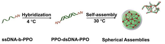 More recently, the smart DNA block copolymer assemblies has been greatly investigated by several groups. The size and morphology of assemblies can be controlled by DNA hybridization or by external stimuli such as temperature, pH value, and ionic strength. In 2012, Liu group developed a pH-responsive morphology-controlling of DNA-b-PPO assemblies [59]. The amphiphilic DNA-b-PPO copolymers were assembled into 20 nm spherical micelles at pH 8.0 and assembled into long nanofibers at pH 5.0. The formation of spherical micelles and nanofibers was attributed to the folding and disassociating of a bimolecular “i-motif” structure at pH 5.0 and 8.0, respectively. Moreover, these shapes can be trans formed reversibly in situ by regulating temperature and pH value. Liu group further utilized DNA-b-PPO to prepare supramolecular triblock copolymers PPO-dsDNA-PPO by DNA hybridization [64]. As shown in Figure 4, the PPO-dsDNA-PPO triblock copolymers were assembled into spherical micelles with a diameter of 200 nm through elevating temperature. This system is different from the usual DNA diblock copolymers, therefore the mechanism of the self-assembly was further explained by molecular dynamic simulations.