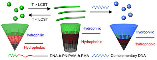 In 2016, Fujita and Meada explored the thermoresponsive structural transition of poly(N-isopropylacrylamide) (PNIPAAm)-b-DNA copolymers [65]. They studied the effects of salt and complementary DNA strand on the assembly process. When the temperature is above the lower critical solution temperature (LCST) of PNIPAAm, PNIPAAm turns insoluble in water. Above the LCST, the amphiphilic DNA copolymers assembled into dispersed spherical micelles at low concentration of salt whether the DNA segment was-single DNA strand or double strand DNA (dsDNA). If heating at high salt concentration, the hybridized copolymer firstly assembled into spherical micelles and further were aggregated due to the decrease of the repulsive interactions by the hybridization and addition of salt. The aggregated nanoparticles could be redispersed when the DNA duplex was denatured by heating. Subsequently, Park group reported the self-assembly behavior and multimodal morphology shifting of DNA-b-PNIPAM and DNA-b-PNIPAM-b-poly(methyl acrylate) (PMA) copolymers [66]. In Figure 5, the diblock copolymer DNA-b-PNIPAM possesses thermo sensitivity from PNIPAM and the molecular recognition properties of DNA. At above LCST, they assembled into spherical micelles. By hybridization and disassociation with complementary DNA-modified gold nanoparticles, it has achieved the aggregation and disaggregation of nanoparticles. DNA triblock copolymers of DNA-b-PNIPAM-b-PMA were composed of a hydrophobic block PMA, a thermo responsive block PNIPAM and an oligonucleotide. Interestingly, DNA-b-PNIPAM-b-PMA micelles were capable of transforming from sphere to cylinder and vise versa by taking advantage of temperature changes. The same morphology transformation existed while keeping the temperature above LCST through DNA hybridization.