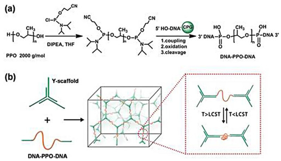 Illustration of the intramolecular collapse of PPO in a 3D DNA network. The solid phase synthesis of ssDNA-b-PPO-b-ssDNA (a) and the formation process of a 3D DNA network (b). The green color stands for DNA strands and the red color indicates PPO. Reproduced with permission from the authors of a previous paper [71]. Copyright 2017 John Wiley and Sons Publisher.