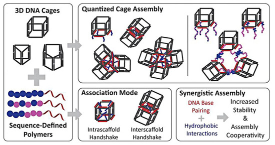 More interestingly, a new amphiphilic DNA polymer hybrid was introduced to combine with 3D DNA nanostructures and created highly complex nanostructures. In 2016, the Sleiman group reported the self-assembly of a sequence-defined hydrophobic polymers on DNA cages based on the synergistic action of hydrophobic interaction and precise base pairing interaction [73]. The sequence-defined DNA block copolymer was composed of long alkyl and oligoethylene glycol repeated units as well as oligonucleotide. As shown in Figure 7, DNA cages of different shapes were combined with these DNA block copolymers to generate a range of new nanostructures by tuning the number of long alkyl groups, the sequence order, and the orientation of the polymers. Hydrophobic polymers decorated on one face of the DNA cage resulted in the formation of monomeric cube, quantized cage assemblies, and “doughnut-shaped” DNA cage-ring structures by changing the polymer length and sequence order of polymers, respectively. Hydrophobic chains modified on both faces of the cage leaded to formation of DNA–micelle cages through an intrascaffold “handshake”. The DNA–micelle cages could encapsulate small molecules and possess better stability than the unsubstituted cage. These studies of new structural and functional DNA nanostructures provided an attractive approach to develop protein-inspired assembly modules in DNA nanotechnology. Subsequently, Sleiman developed a general strategy to transfer DNA patterns from a DNA cube to a polymeric nanoparticle assembled inside the cage in three dimensions. DNA-polymer amphiphiles were decorated at the sides of the DNA cage to form an internal hydrophobic domain. By covalently cross-linking, the DNA printed nanoparticles were generated inside the DNA cube. Due to the base pairing interaction, the DNA strands at the exterior of the polymer nanoparticles could hybridize with the complementary DNA modified nanoparticles to create highly complex nanostructures in a predictable manner. Furthermore, this method has potential application in targeted drug delivery and diagnostics due to the addressability and monodispersity of the resulting particles [74].