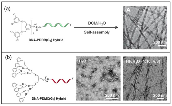 Self-assembly of amphiphilic DNA–Dendron hybrids. (a) Nanofibers from DNA and the second generation (G2) of dendron PDDB (poly(benzyl ether) dendron peripherally modified with dichlorobenzene) hybrids in dichloromethane and water mixture solution. The green segment indicates DNA strand. (b) Spherical micelles and nanofibers from DNA and the third generation (G3) of dendron–PDMC hybrids in water and THF/H2O (1:10, v/v), respectively. The red color of strand indicates DNA. Reproduced with permission from the authors of a previous papers [76,78].