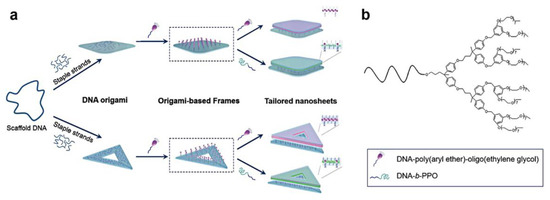 Illustration of the 2D nanosheets assembled from amphiphilic molecules on the DNA origami. (a) First, DDOEG molecules were anchored on the rectangular and triangular DNA origami structures by DNA hybridization, which leads to a high local concentration of hydrophobic molecules on the DNA origami surface. Subsequently, this surface works as a frame to guide the free hydrophobic molecules to assemble through hydrophobic effects, finally to generate continuous 2D nanosheets above the DNA origami. (b) The structure of DDOEG molecule. The purple molecule indicates DDOEG and the light green color indicates PPO segment. Reproduced with permission from the authors of a previous paper [82]. Copyright 2016 John Wiley and Sons Publisher.
