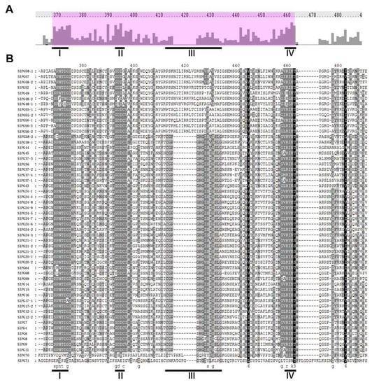 Multiple sequence alignment analysis of the peptides of polygalacturonases (PGs) containing the four typical conserved domains in S. lycopersicum. (A) Alignment of the tomato PG peptides containing the four typical conserved domains. The height of the bars indicates the number of identical residues per position. The underlines illustrate the four typical conserved domains of PGs; (B) Multiple alignments of the peptides of tomato PGs containing four conserved domains. Black and light gray shading, respectively, indicate identical and conserved amino acid residues. Conserved domains are also underlined and correspond to part A.