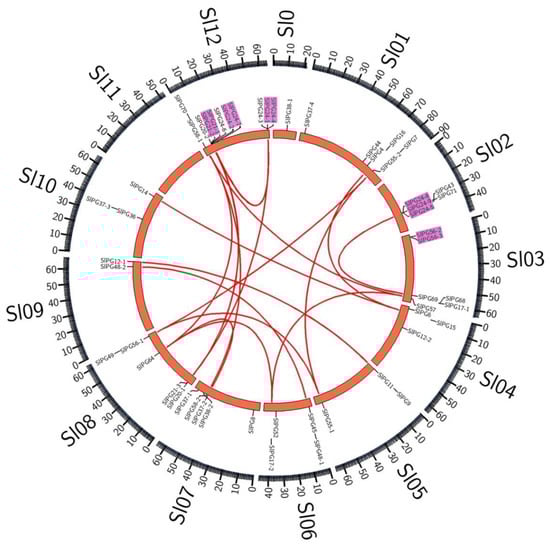 Genomic distribution and syntenic analysis of PG genes in S. lycopersicum generated by CoGe comparative genomics system [] and Circos []. The red lines represent syntenic relationships of the paralogous SlPG genes. The chromosome numbers are demonstrated next to each chromosome. Tandem-duplicated genes are indicated by the pink rectangles.