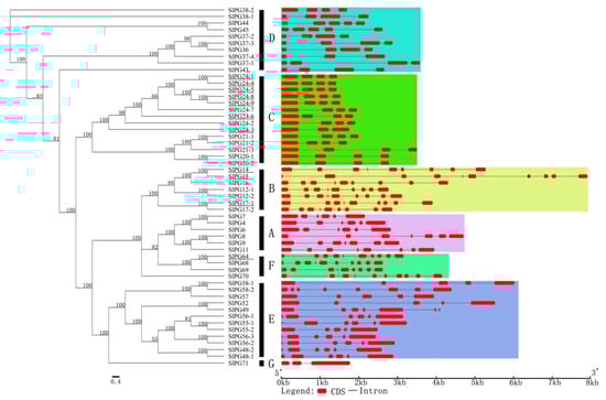 The structure of the intron and exon of the SlPG genes were analyzed using GSDS (available online: http://gsds.cbi.pku.edu.cn/index.php). Phylogenetic analysis was performed by the method of BI using MrBayes 3.1.2 (University of California, San Diego, CA, USA) []. Posterior probabilities (PPs) were calculated under the general time-reversible (GTR) model [,], assuming that rate variation across sites followed a discrete gamma distribution with four rate categories []. Default priors in MrBayes 3.1.2 were used. Markov chain Monte Carlo (MCMC) data simulation was used to estimate the posterior probability. The Markov chain was allowed to run for 1 million generations, taking a random tree as a starting tree and samples every 1000 generations. The first 250 burn-in samples were discarded from the obtained samples, and the common tree was obtained. The reliability of the BI topology tree was viewed by the TreeView program (available online: https://www.treeview.co.uk/).