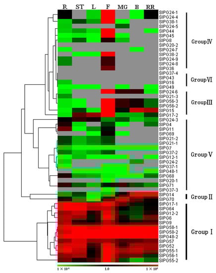Hierarchical clustering and heat map generated by Cluster 3.0 showing the expression levels of SlPG genes among different tissues of S. lycopersicum. The scale bars represent relative expression level. The bright green, bright red, and black shading indicate relatively low, high, and medium expression respectively. The grey shading designates undetectable expression. The vertical dark bar on the right illustrates the six groups of SlPG genes. Different groups are named according to the method used in previous studies []. R: roots, ST: stems, L: leaves, F: flowers, MG: mature green fruit, B: breaker fruit, RR: red ripening fruit.