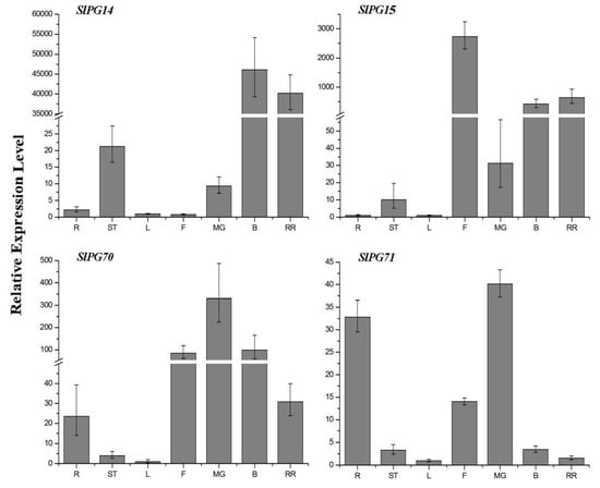 Detailed expression profile analysis of the four SlPG genes based on qRT-PCR analysis in different fruit developmental stages of S. lycopersicum. R: roots, ST: stems, L: leaves, F: flowers, MG: mature green fruit, B: breaker fruit, RR: red ripening fruit.