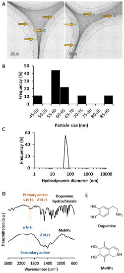 (A) Transmission electron microscopy (TEM) images of MeNPs: Yellow arrows indicate MeNPs; (B) Particle size distribution of MeNPs, estimated from TEM images; (C) Hydrodynamic diameter of MeNPs in distilled water; (D) Fourier Transform Infrared (FT-IR) spectra of dopamine hydrochloride and MeNPs; (E) Chemical structures of dopamine and MeNPs.