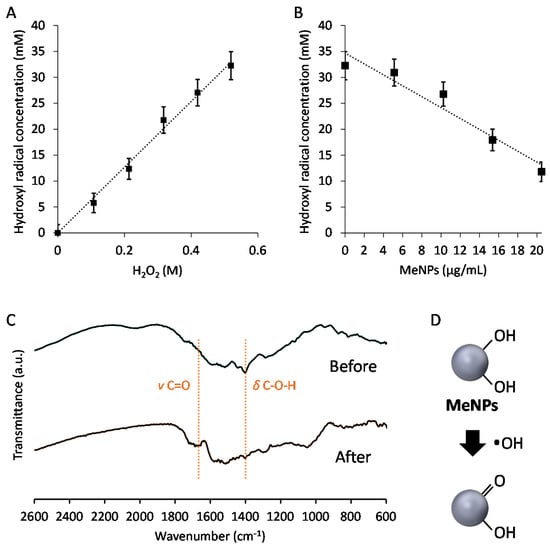 Furthermore, the FT-IR spectra of MeNPs before and after exposure to hydroxyl radicals were obtained (Figure 2C). In the spectrum of MeNPs before exposure to hydroxyl radicals, a peak based on C–O–H in-plane deformation vibration was observed at 1400 cm−1 []. In contrast, the peak attenuated in the spectrum of MeNPs after exposure to hydroxyl radicals, and a peak based on C=O stretching vibration was observed []. These results indicate that MeNPs suppressed hydroxyl radicals by converting some of the hydroxyl groups of MeNPs to ketone groups (Figure 2D).
