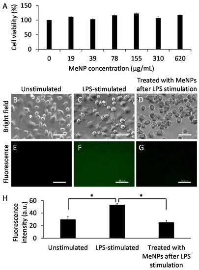 (A) The cytotoxicity of MeNPs in KCs; (B–D) Bright-field and (E–G) fluorescence images of KCs (scale bar 50 μm). Hydroxyl radicals in the medium were detected using APF; (B,E) Unstimulated and (C,F) LPS-stimulated KCs; (D,G) KCs treated with 6.2 μg mL−1 MeNPs after LPS stimulation; (H) Fluorescence intensity of fluorescein in the medium, corresponding to (E–G). * p < 0.05.