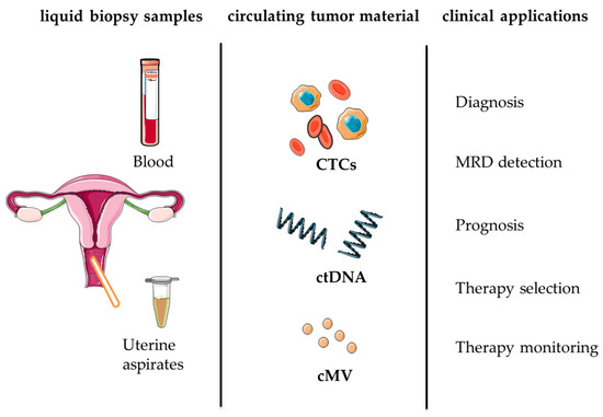 Liquid biopsy for personalised medicine in endometrial cancer. CTCs (circulating tumor cells), ctDNA (circulating tumor DNA), cMV (circulating microvesicles), MRD (minimal residual disease).