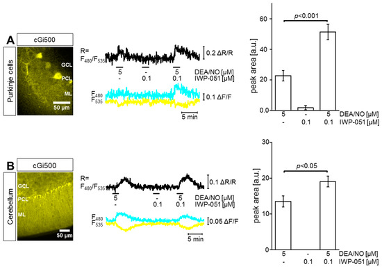 Figure 1B summarizes cGMP measurements performed in the granule cell layer (GCL) of acute cerebellar slices prepared from NesCre;R26-CAG-cGi500(L2) mice. These mice express cGi500 broadly in neural tissue including neurons and glial cells (Figure 1B left, yellow). It is important to note that these mice do not express the sensor in cerebral blood vessels (red structures in Figure 2A and Figure 3A). It is well known that blood vessels generate strong NO-induced cGMP signals. If they would express cGi500, then they would likely confound cGMP imaging of neural tissue. Similar to the cGMP signaling pattern observed in Purkinje cells, the application of DEA/NO (5 µM) resulted in a robust elevation of cGMP in the GCL, while IWP-051 (0.1 µM) alone was not effective. However, the combination of DEA/NO with IWP-051 significantly potentiated the magnitude of the cGMP signal in the GCL ~1.5-fold as compared to the signal induced by DEA/NO alone (Figure 1B middle and right). A similar potentiation of NO-induced cGMP signals by IWP-051 was detected in the Purkinje cell layer and granule cell layer of R26-CAG-cGi500(L1) mice with global expression of the cGMP sensor (data not shown).