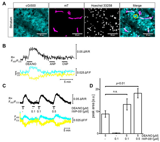 IWP-051 potentiates DEA/NO-induced cGMP signals in the striatum. (A) Representative pictures of the striatum in fixed NesCre;R26-CAG-cGi500(L2) brain sections showing expression of cGi500 (cyan) and membrane-targeted tomato protein (mT, magenta), staining of nuclei with Hoechst (grey), and an overlay of all three channels (Merge). The yellow circle shows a representative ROI chosen for analysis; (B) Representative cGMP measurement in an acute striatal brain slice from a NesCre;R26-CAG-cGi500(L2) mouse. During measurement, 5 µM DEA/NO, 0.25 µM ANP and 0.25 µM CNP were applied (black horizontal bars). Black, cyan and yellow traces represent CFP/YFP ratio, CFP and YFP, respectively; (C) Representative cGMP measurement in the striatum with DEA/NO and IWP-051 in the indicated concentrations (black horizontal lines). For cGMP imaging, striatal cells were selected that were separated from surrounding blood vessels to avoid false-positive signals (e.g., yellow circle in panel (A)); (D) Statistical analysis was performed with peak areas of the respective cGMP signals; data are shown as mean ± SEM (n = 6 ROIs from three brain slices); n.s., not significant. Similar results were obtained in independent experiments with additional mice and brain slices (see Figure 6A,C, wildtype).