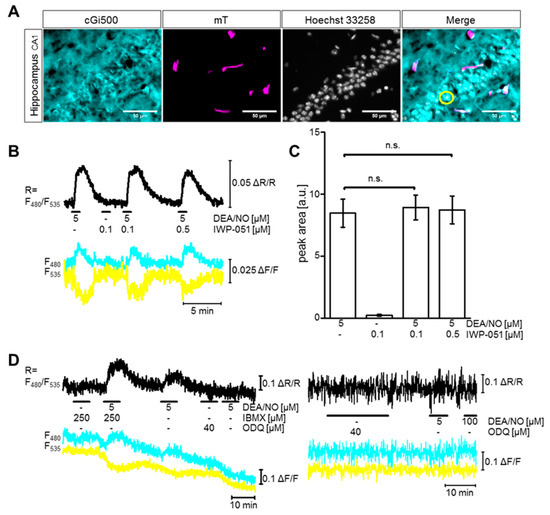 IWP-051 does not potentiate DEA/NO-induced cGMP signals in the hippocampal CA1 area. (A) Representative pictures of the hippocampal CA1 area in fixed NesCre;R26-CAG-cGi500(L2) brain sections showing expression of cGi500 (cyan) and membrane-targeted tomato protein (mT, magenta), staining of nuclei with Hoechst (grey), and an overlay of all three channels (Merge). The yellow circle shows a representative ROI chosen for analysis; (B–D) cGMP imaging of hippocampal cells in the CA1 region was performed in acute hippocampal brain slices from NesCre;R26-CAG-cGi500(L2) mice. To avoid false-positive signals, only regions of interest that were separated from surrounding blood vessels were analyzed (e.g., yellow circle in panel (A)). Black, cyan and yellow traces represent CFP/YFP ratio, CFP and YFP, respectively; (B) Representative experiment in which DEA/NO and IWP-051 were applied in the indicated concentrations (black horizontal lines) and (C) statistical analysis of peak areas of respective cGMP signals; data are shown as mean ± SEM (n = 9 ROIs from three brain slices); n.s., not significant. Similar results were obtained in independent experiments with additional mice and brain slices (see Figure 6B,D, wildtype). (D) Representative experiments in which 3-isobutyl-1-methylxanthin (IBMX) and 1H-[1,2,4]oxadiazolo[4 ,3-a]quinoxalin-1-one (ODQ) were applied before or in combination with DEA/NO application. The respective concentrations are indicated in the graphs. Similar results were obtained in at least three ROIs measured on two brain slices (IBMX and ODQ, left) or one brain slice (ODQ, right).