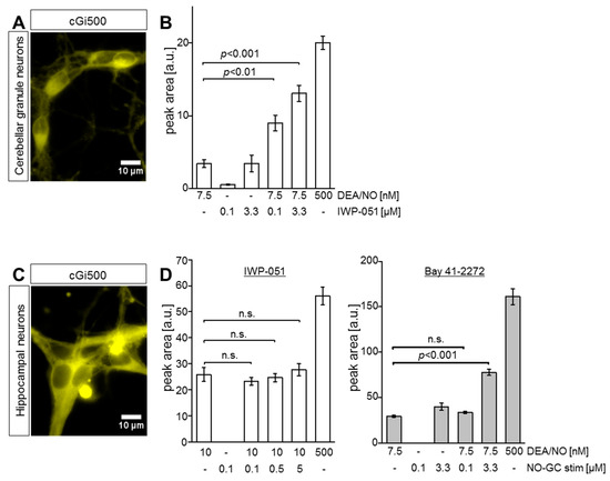 IWP-051 potentiates DEA/NO-induced cGMP signals in primary cerebellar granule neurons (CGNs), but not in hippocampal neurons (HNs). (A) Representative picture of primary cGi500-expressing CGNs (yellow) isolated from R26-CAG-cGi500(L1) mice; (B) Statistical analysis of cGMP imaging in CGNs, showing peak areas of cGMP signals evoked by DEA/NO and IWP-051. Respective concentrations are indicated below the graph; data are shown as mean ± SEM (n = 7 cells from two coverslips); (C) Representative picture of primary cGi500-expressing HNs (yellow) isolated from R26-CAG-cGi500(L1) mice; (D) Statistical analysis of cGMP imaging in HNs, showing peak areas of cGMP signals induced by DEA/NO and IWP-051 (left, n = 12 cells from two coverslips) or DEA/NO and Bay 41-2272 (right, n = 6 cells from one coverslip). Data are shown as mean ± SEM. Respective concentrations are indicated below the graphs; n.s. not significant.