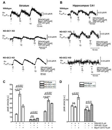 cGMP imaging in acute brain slices of NO-GC1 and NO-GC2 knockout mice reveals different activities of IWP-051 and Bay 41-2272 in (A,C) striatum and (B,D) hippocampus. Representative cGMP measurements (showing CFP/YFP ratios) performed (A) in the striatum and (B) hippocampus of wildtype, NO-GC1 KO and NO-GC2 KO mice that had been crossed to NesCre;R26-CAG-cGi500(L2) mice and, thus, expressed cGi500 in neurons and glia cells. DEA/NO, IWP-051, and Bay 41-2272 were applied in the indicated concentrations (black horizontal lines). Statistical analysis of respective cGMP signals in (C) striatum (wildtype, n = 22; NO-GC1 KO, n = 16; NO-GC2 KO, n = 16) and (D) hippocampus (wildtype, n = 22; NO-GC1 KO, n = 9) was performed with peak areas; data are shown as mean ± SEM (n-numbers represent number of evaluated ROIs from at least three brain slices per genotype); n.s., not significant. To avoid false-positive signals, only ROIs that were separated from surrounding blood vessels were analyzed. Note that the absence of detectable cGMP signals in the hippocampus of NO-GC2 KO precluded statistical analysis. For each genotype and brain region, similar results were obtained in independent experiments with brain slices from three mice.