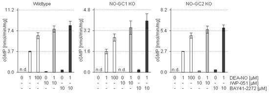In vitro assays with brain homogenates do not show NO-GC1-specific activity of IWP-051. cGMP-forming activities of whole brain homogenates of wildtype, NO-GC1 KO and NO-GC2 KO mice were measured by [32P] cGMP formation. Homogenates were incubated with the indicated concentrations of DEA/NO, IWP-051, and Bay 41-2272. As the knockout of either one of the NO-GC isoforms reduces the cGMP-forming activity, the panels have different ordinates. Open, light gray and dark gray bars show activities in the absence of NO-GC stimulators, in the presence of IWP-051 and in the presence of BAY41-2272, respectively. Data are shown as mean ± SD of three independent biological replicates analyzed for each genotype (n = 9 mice in total); n.d., not detectable.