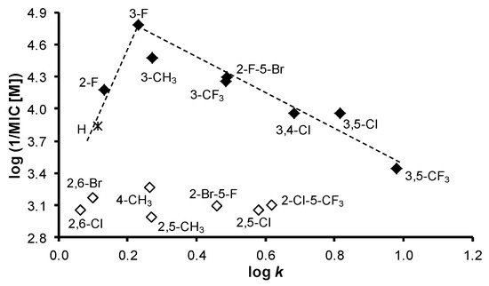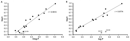 3.2. Lipophilicity Determination by HPLC (Capacity Factor k/Calculated log k)