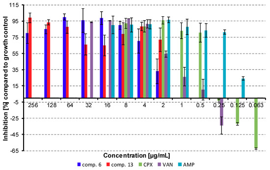 | Comp. | Concentration (μg/mL) | Inhibition (%) Compared to Negative Control | Comp. | Concentration (μg/mL) | Inhibition (%) Compared to Negative Control |