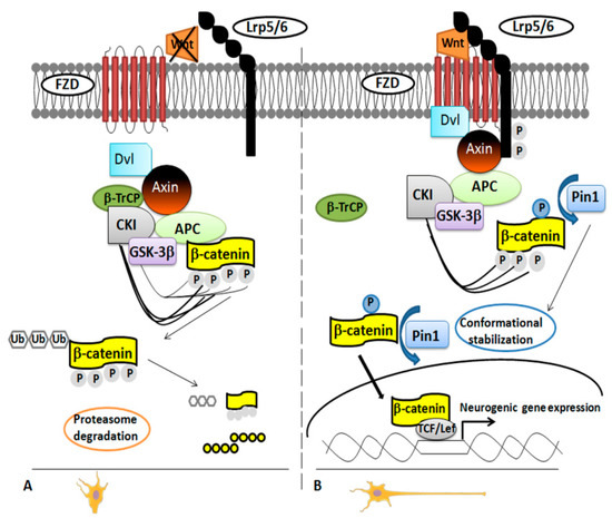 In 2012, it was demonstrated that Pin1 regulates differentiation of cortical neurons by affecting the Wnt/β-catenin pathway [36]. Pivotal in neurogenesis [36,41], the Wnt/β-catenin pathway works on the two main steps of the neural stem/progenitor cells (NPCs) development: the expansion phase, stimulating proliferation; and the neurogenic phase, regulating the timing and the area of the neuronal differentiation [36,42]. There was no doubt that the β-catenin functionality is regulated by phosphorylation, but the exact mechanism was unclear for long time until β-catenin was identified as specific substrate of Pin1 in NPCs. The researchers used a proteomic approach, glutathione S-transferase (GST)-pull down strategies followed by Electrospray Ionization-Mass Spectrometry (ESI-MS) analysis [36] to demonstrate that Pin1 regulates β-catenin functionality by modulating its conformation after the phosphorylation in the Ser246-Pro motif [36,43]. This occurred in the later phases of neuronal differentiation both in NPCs and mouse brain (Figure 1).