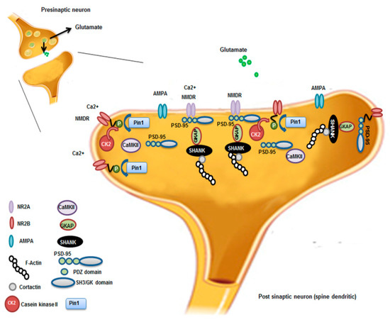 Furthermore, Pin1 influenced synaptic plasticity by regulating protein ubiquitination and degradation of postsynaptic density (PSD) proteins. By using a proteomic approach, Xu and collaborators demonstrated the association between Pin1 and Shank proteins at dendritic rafts of neuronal cells and PSD isolated from the synaptosome fractions obtained from the frontal cortical tissues of AD patients and controls [81]. Shank proteins have an “organizing role” in dendritic rafts and PSD. In cultured cortical neurons from Pin1 KO and control mice, Xu and collaborators verified the role of Pin1 in synaptic plasticity, inhibiting both Pin1 (with PiB treatment) and proteasome activity (by using MG132, carbobenzoxy-Leu-Leu-leucinal peptide). Ubiquitinated proteins in the PSD increased after the simultaneous treatment with PiB and MG132. This deregulated pathway determined an enhanced degradation of Shank3 and other PSD proteins, with a consequent alteration in PSD structure from AD brains. Pin1 modulated the NMDA receptor-mediated turnover of Shank proteins. In this regard, Tang and co-workers who studied Pin1 modulation in TLE patients [62], hypothesized that reduced Pin1 activity caused not only misfolded proteins, but also the generation of aberrant synapses contributing to the progression of pre-clinical AD [81].