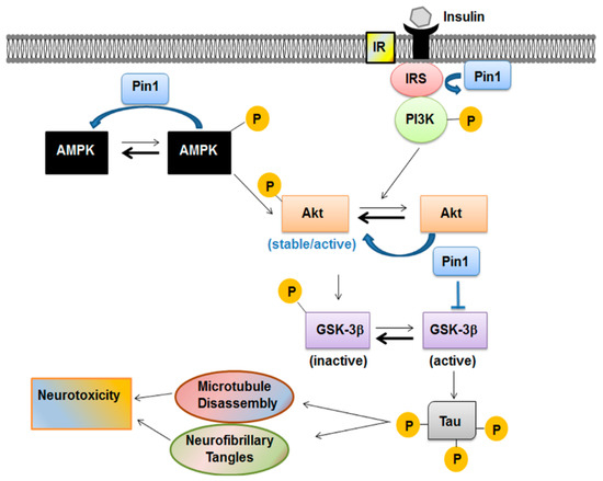 Pin1 in the metabolic pathway acts as a negative regulator of AMPK and modulates the Akt active form. Insulin promotes neuronal cytoskeletal dynamics via Akt phosphorylation. Activation of insulin signaling leads usually to activation of phosphatidyl-inositol-3-kinase/Akt (PI3K/Akt) pathway. After being activated through its phosphorylation mainly at Thr308 residue, Akt phosphorylates glycogen synthase kinase-3β (GSK-3β) at Ser9 and inactivates GSK-3β kinase activity. GSK-3β is also the major protein kinase regulating tau phosphorylation in the brain. Pin1 modulates all these players involved in the signaling cascade.