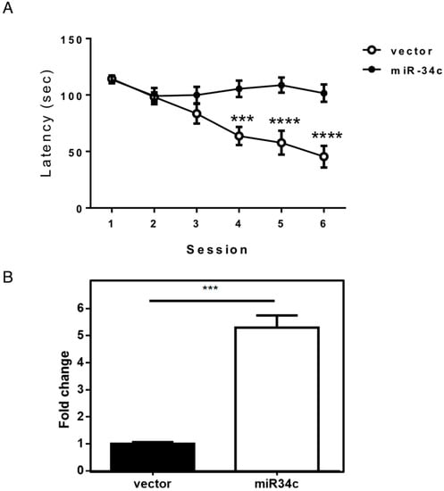 Overexpression of miR-34c caused memory impairment. (A) Escape latencies of mice overexpressing miR-34c and control vector (vec) mice (n = 16 in each group) in the Morris water maze. The asterisks represent the level of statistical significance calculated by a two-way analysis of variance (*** p < 0.001, **** p < 0.0001); (B) Hippocampal miR-34c expression levels were determined by quantitative PCR in mice transfected with miR-34c construct or mice transfected with the control vector and calculated using a two-tailed Student’s t-test (*** p < 0.001).