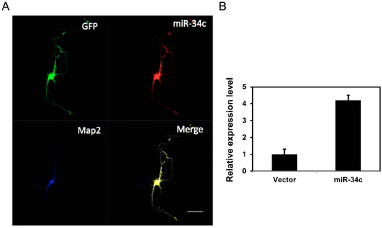 We observed that miR-34c was expressed in cultured hippocampal neurons. (A) Transfection of miR-34c was identified on DIV7 through immunofluorescence staining. Cells co-expressing green fluorescence (from GFP+/− mice) and red fluorescence (from miR-34c-transfected cells) were selected, and neural dendrites were confirmed using the Map2 antibody. Scale bar = 50 μm; (B) The expression level of miR-34c in the cultured hippocampal cells transfected with the miR-34c construct or control vector were detected using RT-PCR and calculated using a two-tailed Student’s t-test.