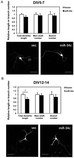 To investigate the effect of miR-34c on neuronal morphology, we measured the total dendritic length, dendritic main shaft, and dendritic branch numbers of the hippocampi two days after transfection. In the earlier stage—DIV 7—it appeared that miR-34c suppressed the outgrowth and branching of dendrites; however, this result was nonsignificant (Figure 3A). In the later stage—at DIV 14—the total dendritic length of neurons with miR-34c overexpression had a shorter dendritic length than did the neurons transfected with the control vector (Figure 3B). The numbers of dendritic shafts and branches were slightly decreased in the miR-34c-overexpression group; however, this result was nonsignificant. Therefore, miR-34c partially inhibited dendritic outgrowth but did not affect dendritic branching.