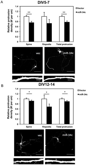 We observed that miR-34c lowered dendritic spine density and total protrusion density. Quantification of the protrusion density of neurites including mature spines, immature filopodia, and the summation of both using immunostaining on the (A) DIV 7 (Scale bar of upper panel = 100 μm; lower panel = 5 μm) and (B) DIV 14 in miR-34c and vector-transfected (vec) cells (n = 28 in each group) was conducted under 100× magnification and calculated using a two-tailed Student’s t-test (* p < 0.05, ** p < 0.01). Scale bar of upper panel = 100 μm; lower panel = 5 μm.