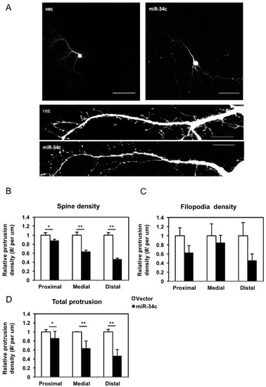 Cells plated in six-well plates were transfected at DIV5 or DIV12. Thirty minutes before transfection, the medium was replaced with P/S antibiotics-free Neurobasal medium. The ubiquitin promoter-driven miR-34c plasmid, or vector only, were transfected into hippocampal primary culture with Lipofectamine 2000 (Invitrogen) for 2 h. The transfected cells were cultured for two days and analyzed by confocal microscopy for neuronal morphology or collected to extract RNA samples.
