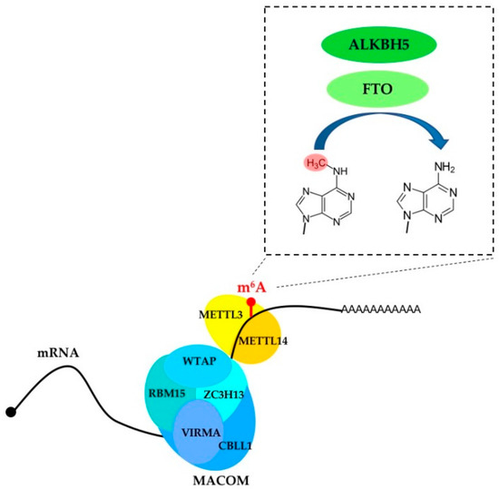 m6A modification is installed by the core METTL3/METTL14 (methyltransferase-like protein 3/methyltransferase-like protein 14) catalytic complex and erased by the two demethylases FTO (fat mass and obesity-associated) and ALKBH5 (alkB homologue 5). The MACOM complex, composed of WTAP (Wilms tumor 1-associated protein), RBM15 (RNA-binding motif 15), VIRMA (Vir-like m6A methyltransferase-associated), ZC3H13 (zinc finger CCCH-type containing 13) and CBLL1 (Cbl proto-oncogene like 1), guides the core complex on specific mRNAs and contributes to select specific sites within single mRNA.