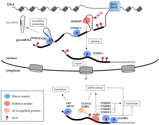 Functional roles of m6A modification on mRNA expression. Most of m6A’s effects on mRNA metabolism are mediated by reader proteins whose binding can be directly or indirectly affected by m6A. In the nucleus, the direct readers are YTHDC1 and HNRNPA2, which stimulate splicing and microRNA processing, respectively. YTHDC1 also stimulates mRNA export. The splicing regulator HNRNPC (heterogeneous nuclear ribonucleoprotein) is an indirect reader whose binding is favored by structural rearrangement induced by m6A modification. In the cytoplasm, mRNA translation is stimulated by the direct reader eIF3, ABCF1 (ATP binding cassette subfamily F member 1), YTHDF1, YTHDF3 and YTHDC2, while it is inhibited by the indirect reader FMR1. mRNA decay is increased by the direct readers YTHDF2, YTHDF3 and YTHDC2, while it is inhibited by the direct readers IGF2BPs (insulin-like growth factor 2 mRNA-binding protein) and the m6A-repelled proteins ELAVL1 (ELAV like RNA binding protein 1) and G3BPs (G3BP stress granule assembly factor).