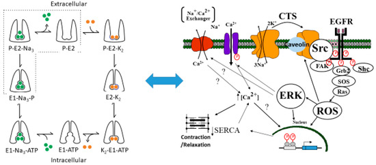 The Na/K-ATPase is a P-type ATPase discovered in the 1950s by Skou [1]. It is arguably one of the most important proteins in animal biology. It has been known since Skou’s original discovery to play a key role in ion transport (hence its alternate name, “sodium pump”), and the conformational changes which occur during the solute pumping have been elucidated specifically by Post and Albers, whose names grace the model most often used to describe this ion transport by this protein [2,3]. However, in addition to this ion transport function, studies from the Xie/Shapiro laboratories also showed that the Na/K-ATPase also plays an essential role in cell signal transduction and reactive oxygen species (ROS) regulation [4,5,6]. It has been postulated that this signaling function is related to a scaffolding function of the Na/K-ATPase controlling the activity of the rous sarcoma gene product (Src) kinase [7,8,9]. This is illustrated in Figure 1.