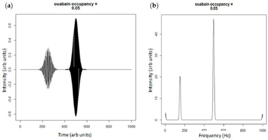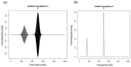 Although we have previously described a pool of “non-pumping” pumps to describe the signaling portion of the Na/K-ATPase [29], it is far more likely (and consistent with our other observations) that the signaling portion of the Na/K-ATPase cycles through different conformations more slowly and is, thus, much less relevant to ion transport that the non-signaling pool. While it is a gross oversimplification to consider residence within caveolae to define the signaling vs. pumping pump, it does appear that the signaling pump does associate with Src and caveolin [8]. However, to illustrate the difference (Figure 3 and Figure 4), we will continue to use both frequency and space to separate these two pools. If we look at ouabain as a pharmacological tool to shift more Na/K-ATPase into the E2 state (ultimately dis-inhibiting Src kinase), the wave function simulations might look something like Figure 4.