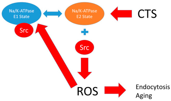 Schematic of Na/K-ATPase showing the release of Src with conversion into the E2 state (stimulated by ROS and CTS) with further generation of ROS inducing endocytosis and aging. See associated differential equations in Appendix A.