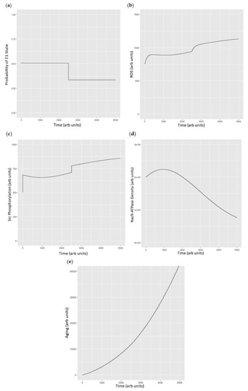 (a) Probability of the E1 state under basal conditions and then with the simulated addition of ouabain at 100 µM (approximately 10% of the IC50) at time = 2500; (b) simulated changes in ROS under basal conditions and after addition of simulated ouabain at time = 2500. Units of ROS are arbitrary; (c) Src phosphorylation as total phosphorylated Src vs. time with conditions described above. Src concentrations are arbitrary beyond the understanding that ½ of the Src pool is under control of the Na/K-ATPase and ½ is not; (d) plasma Na/K-ATPase under basal conditions and following addition of ouabain which stimulates endocytosis (at t = 2500); and (e) cell aging as a function of ROS with ROS generated through the Na/K-ATPase oxidant amplification loop and Na/K-ATPase endocytosis set to be approximately 1000 times as efficient and inducing “aging”, as we have recently described [32].