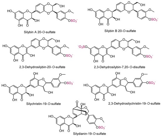 - Purchartová, K.; Engels, L.; Marhol, P.; Šulc, M.; Kuzma, M.; Slámová, K.; Elling, L.; Křen, V. Enzymatic preparation of silybin phase II metabolites: Sulfation using aryl sulfotransferase from rat liver. Appl. Microbiol. Biot. 2013, 97, 10391–10398. [Google Scholar] [CrossRef] [PubMed]