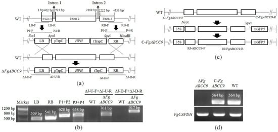Construction of deletion and complementation mutants for FgABCC9. (a) The left border (LB) and the right border (RB) were amplified from the wild type (WT) strain to construct the recombinant plasmid. ΔFgABCC9 mutants were then created by homologous recombination between the plasmid and FgABCC9. (b) PCR verification of ΔFgABCC9. (c) Gene sequence of FgABCC9 was amplified from the genomic DNA of WT and ligated into the complementation vector. The T-DNA region of the complementation vector was inserted into the genome of ΔFgABCC9 to create C-FgABCC9. SacI, ApaI, SpeI, HindIII, NcoI, and SpeI show the restriction enzymes used. (d) RT (reverse transcription)-PCR of FgABCC9 in C-FgABCC9 using RJ-ABCC9-F + RJ-ABCC9-R. FgGAPDH was used as reference. The black lines under the elements in (a) and (c) represent the targeted location of primers listed in Table 1. LB-F + LB-R, RB-F + RB-R, C-FgABCC9-F + C-FgABCC9-R were located in the genomic sequence of FgABCC9 of the WT strain. P1-F + P2-R and P3-F + P4-R were mapped in the T-DNA fragment of the pRF-HU2 vector. ΔJ-U-F, ΔJ-U-R, ΔJ-D-F, and ΔJ-D-R were, respectively, positioned into the upstream and downstream of inserted T-DNA sequence of ΔFgABCC9. All the PCR products were verified by sequencing in the commercial company (Qingke, Chengdu, China).